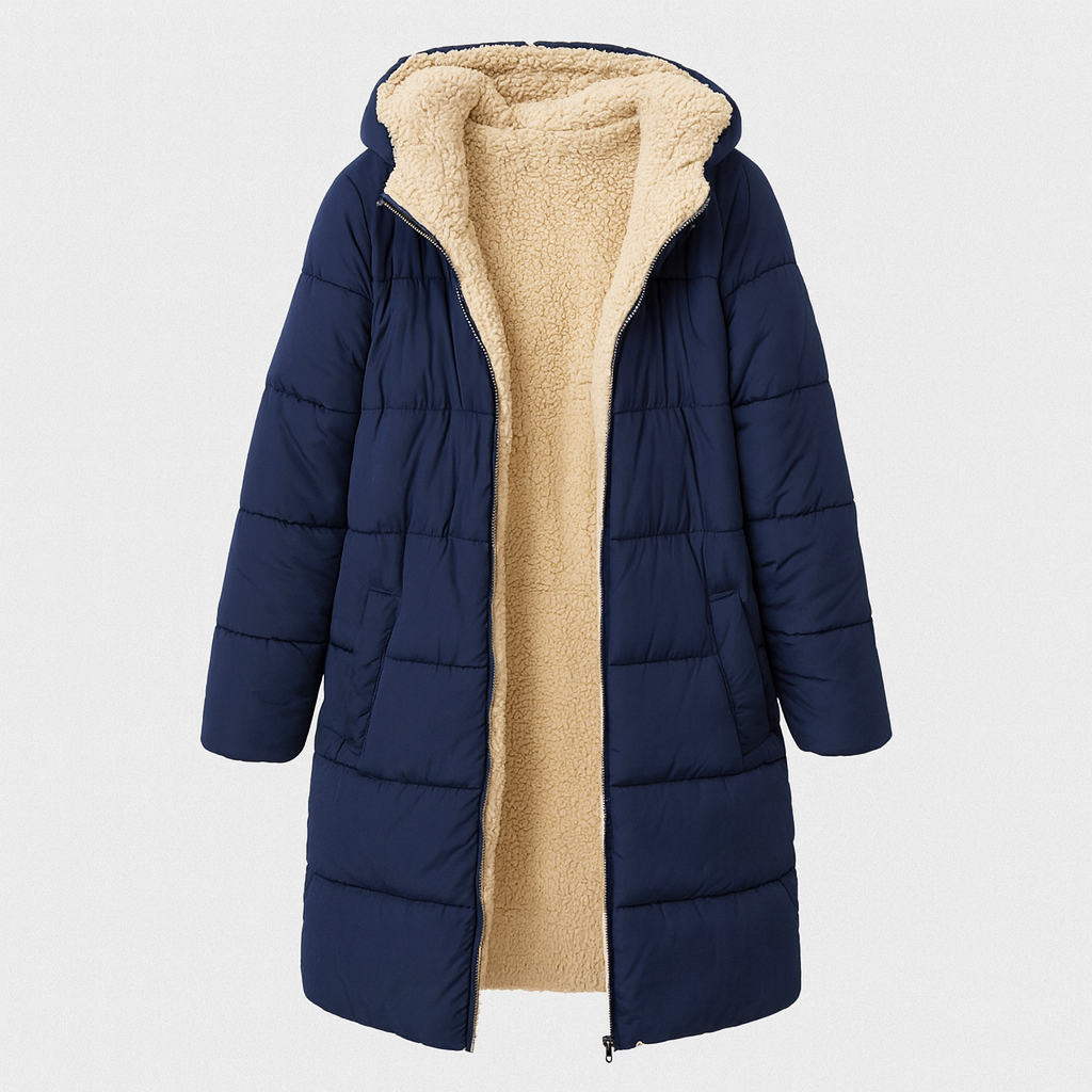 Den mysiga huvan skyddar mot snö och vind, och den längre silhuetten håller dig varm även under de kallaste vinterdagarna. Färgvalen är noggrant utvalda för att passa en modern, stilren vintergarderob.