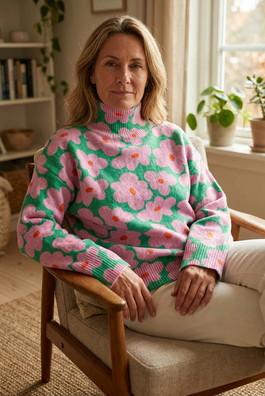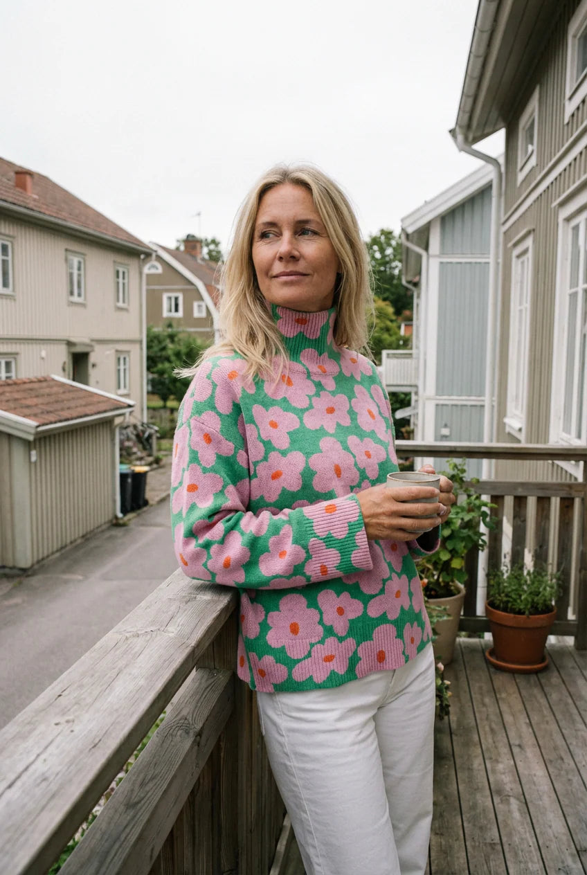 Lara är tröjan för dig som vill bära färg på ett sätt som fortfarande känns lugnt och bekvämt. Det blommiga mönstret ger liv och personlighet, medan den genomtänkta passformen gör tröjan lätt att bära i vardagen.